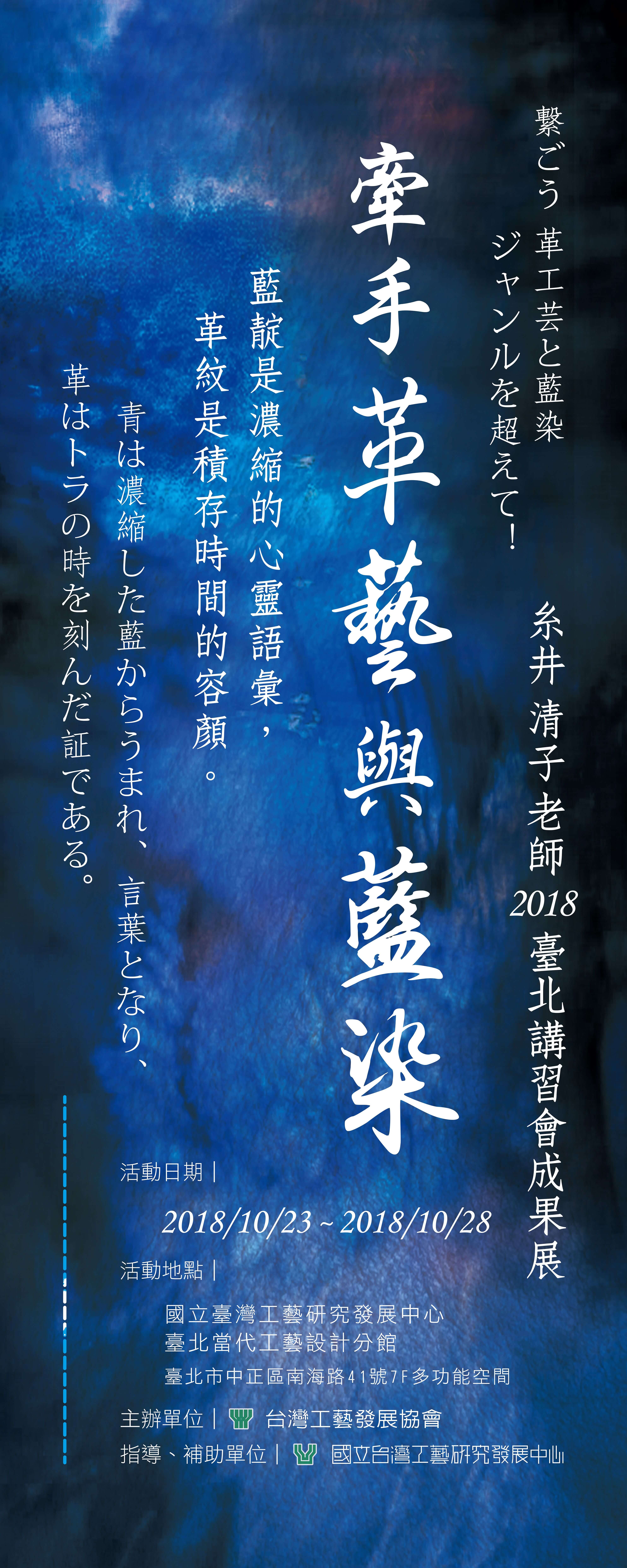 牽手革藝與藍染–2018糸井 清子台北講習會成果展 View Larger Image 牽手革藝與藍染–2018糸井 清子台北講習會成果展 展期:2018/10/23~2018/10/28 展點:國立台灣工藝研究發展中心7樓多功能空間(台北市南海路41號) 主辦單位:台灣工藝發展協會 補助/指導單位:國立台灣工藝研究發展中心 管理者022018-10-26T10:08:54+08:00