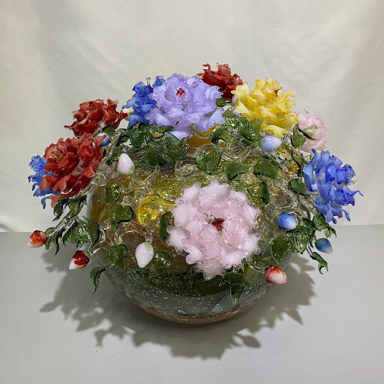 使用玻璃拉製的技法呈現出牡丹花盛開的模樣,並運用不同的配色技巧於聚寶瓶身勾勒出大自然的樣態。作品寓意生機勃勃的自然生態。