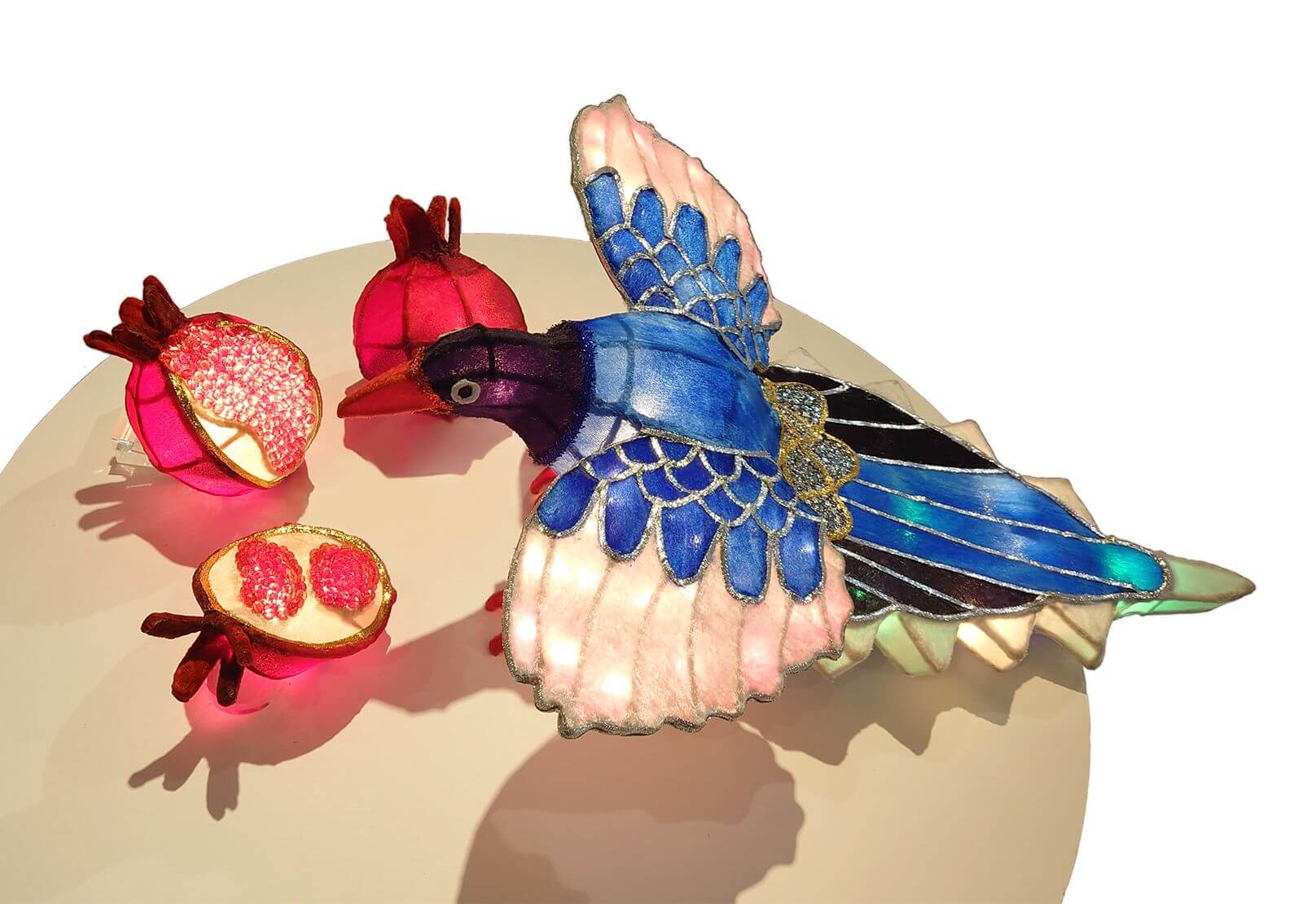 藍鵲是臺灣特有的鳥種且被列為保育類動物。在臺灣的山林地區常可見到牠紅色嘴巴藍色身、有著兩根常常黑白花紋的羽尾,非常特別 ! 此組作品將藍鵲搭配紅色的石榴不但色彩鮮明點燈後即亮麗無比十分美麗。