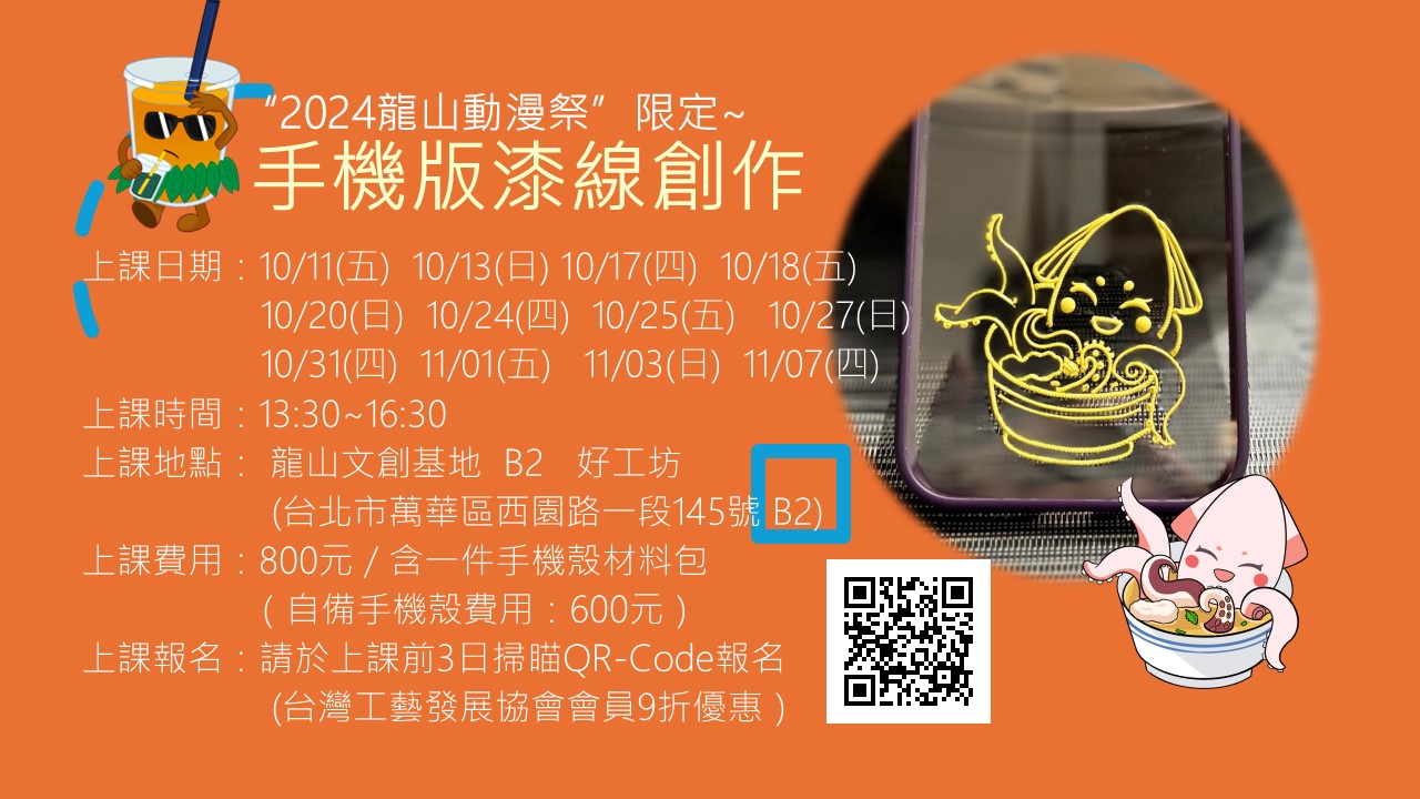 漆藝永傳(單堂體驗課) 上課日期: 9/8(日)、 9/12(四)、 9/13(五)、 9/15(日)、9/19(四)、9/20(五)、9/22(日)、9/26(四)、9/27(五)、 9/29(日) 上課時間:13:30~16:30 上課地點: 龍山文創基地 B2 好工坊 (台北市萬華區西園路一段145號) 上課費用:800元 / 含一件成品材料包 (手機殼或陶盤擇一) 上課報名:請於上課前3日掃瞄QR-Code報名 (台灣工藝發展協會會員9折優惠) 報名連結: https://forms.gle/T791Mxf1GKoNzjuH8