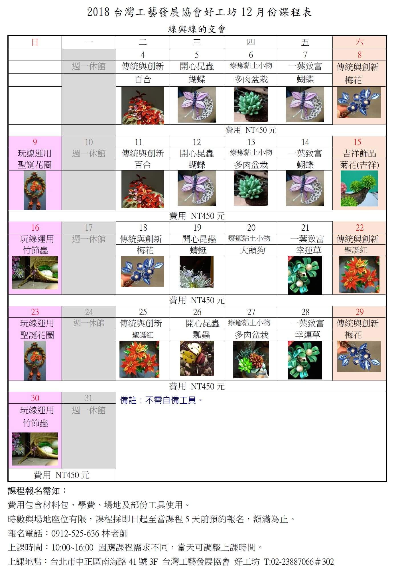 本會好工坊12月份課程表出爐嘍~~~ View Larger Image 本會好工坊12月份課程表出爐嘍~~~ 請參考好工坊粉絲頁: https://www.facebook.com/CraftsUnionStudio/ 小編偷偷告訴大家:(淑瓊老師說) 工藝協會會員、工藝中心同仁及志工,課程打8折,滿10堂課打7折。 一般民眾,課程滿10堂課打9折。 (……不騙大家,加入台灣工藝發展協會會員超~~划算啦~!) 管理者022018-12-05T15:01:08+08:00
